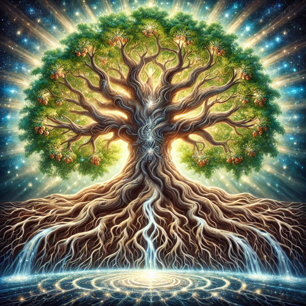 Una grande Quercia della Connessione le cui Radici fluiscono dall'Utero di Terra Madre verso il centro della Terra e si uniscono in un intreccio tra femminile e maschile, traendo nutrimento e linfa vitale. Si erge il tronco poderoso per aprirsi nella danza di rami che si uniscono come mani protese verso il cielo e che offrono frutti succosi per ogni figlia e figlio della Terra e degli Elementi, umano, animale, vegetale, minerale, elementale.