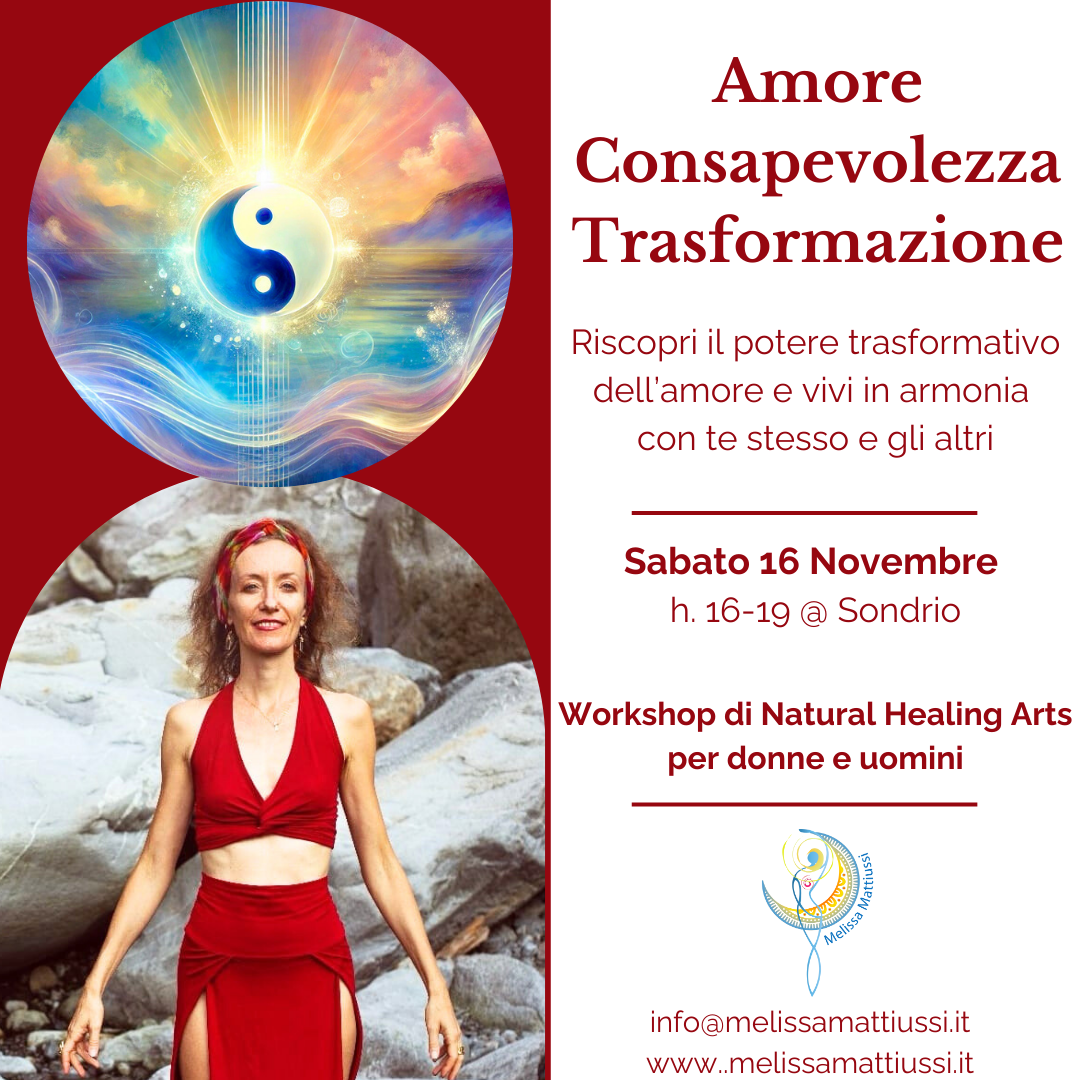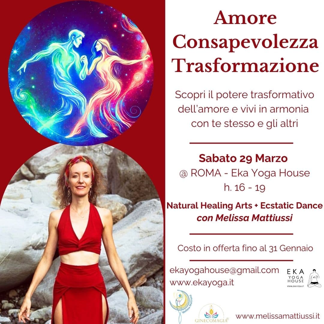 Amore, Consapevolezza, Trasformazione è un workshop di crescita e trasformazione attraverso le Natural Healing Arts e l'Ecstatic Dance, aperto a donne e uomini.